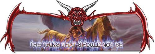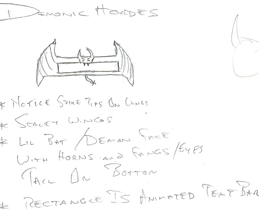 Here is what I want to have done. I want the "Title Bar" to kind of look like a Demon Figure or Gargoyle like figure, with Wings on the ends with lil horns atop the wing tips, red lines through the wings...telling me it's demonic and scaly. The lil Demon face in the middle obviously redrawn and such. I think in my crude sketch I made the wings too big or tall, so that might need to be sized down some. The rectangle in the middle is where I was going to put like animated liquid...like blood or something...but I again can't find a damned soul on this earth to create a simple but "good looking" bubble effect for the blood...a'la Diablo-esque. So I'd just take two different sketches for this, one with a rectangle area cut in the flesh/stone of the demon to which I can put the text. N' another sketch without the rectangle and I'll just center the text in there when I apply it. Lastly I'm sure you can see the little Tail below, that is of course for dramtic effect, and is not a neccessity as I skipped on the feet you notice. I guess I'm trying to create an image of "it's flying towards us".