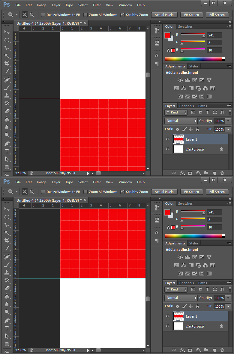 Do you know how to move the red layer up 1/2 pixel, which was my question in my first post? The red will not be centered exactly until it is moved up 1/2 pixel.