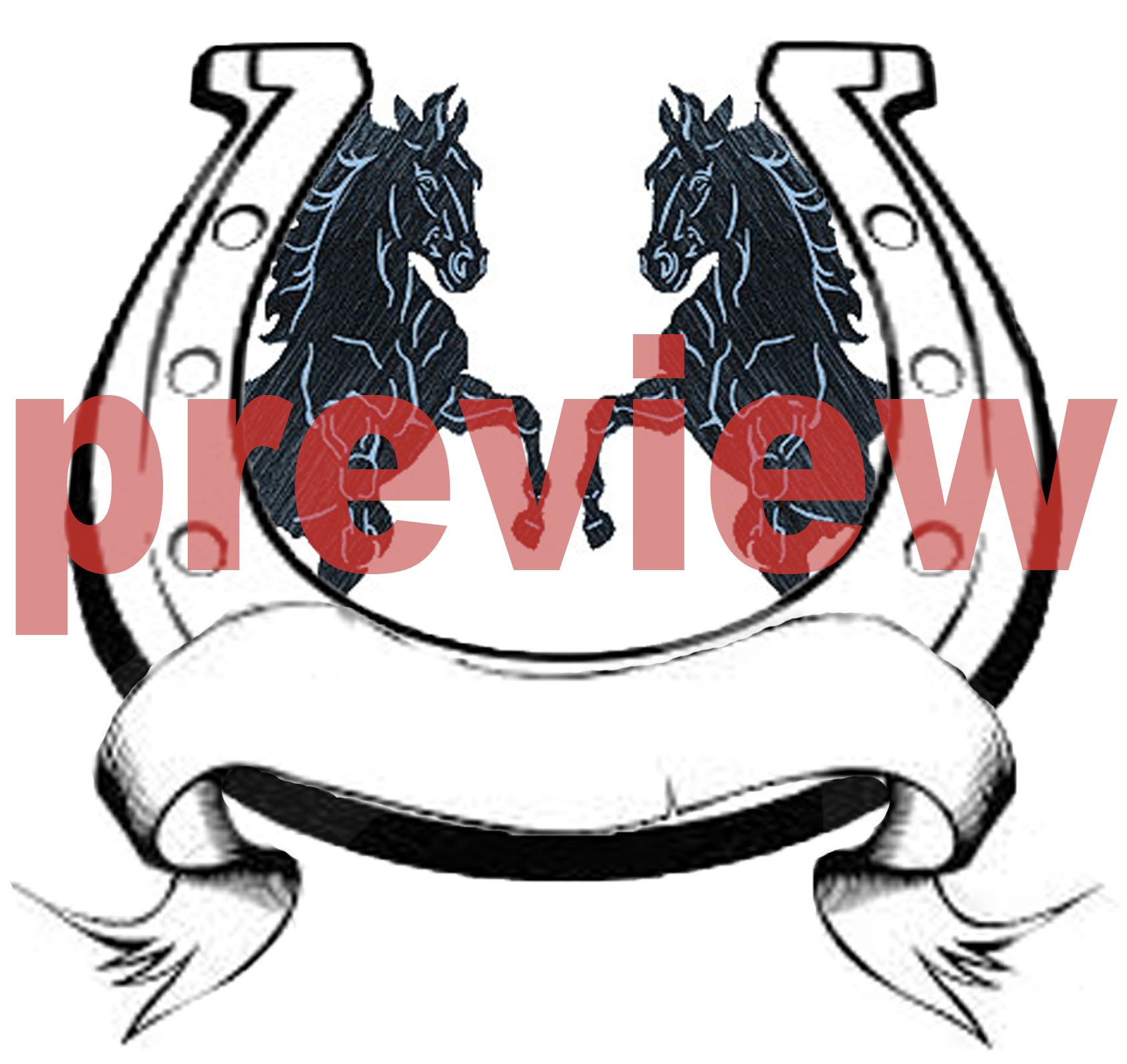 Two rearing horse facing each other, then the horseshoe big and around then both, then the motif also the bottom sort of covering the lower half of some of the horseshoe.